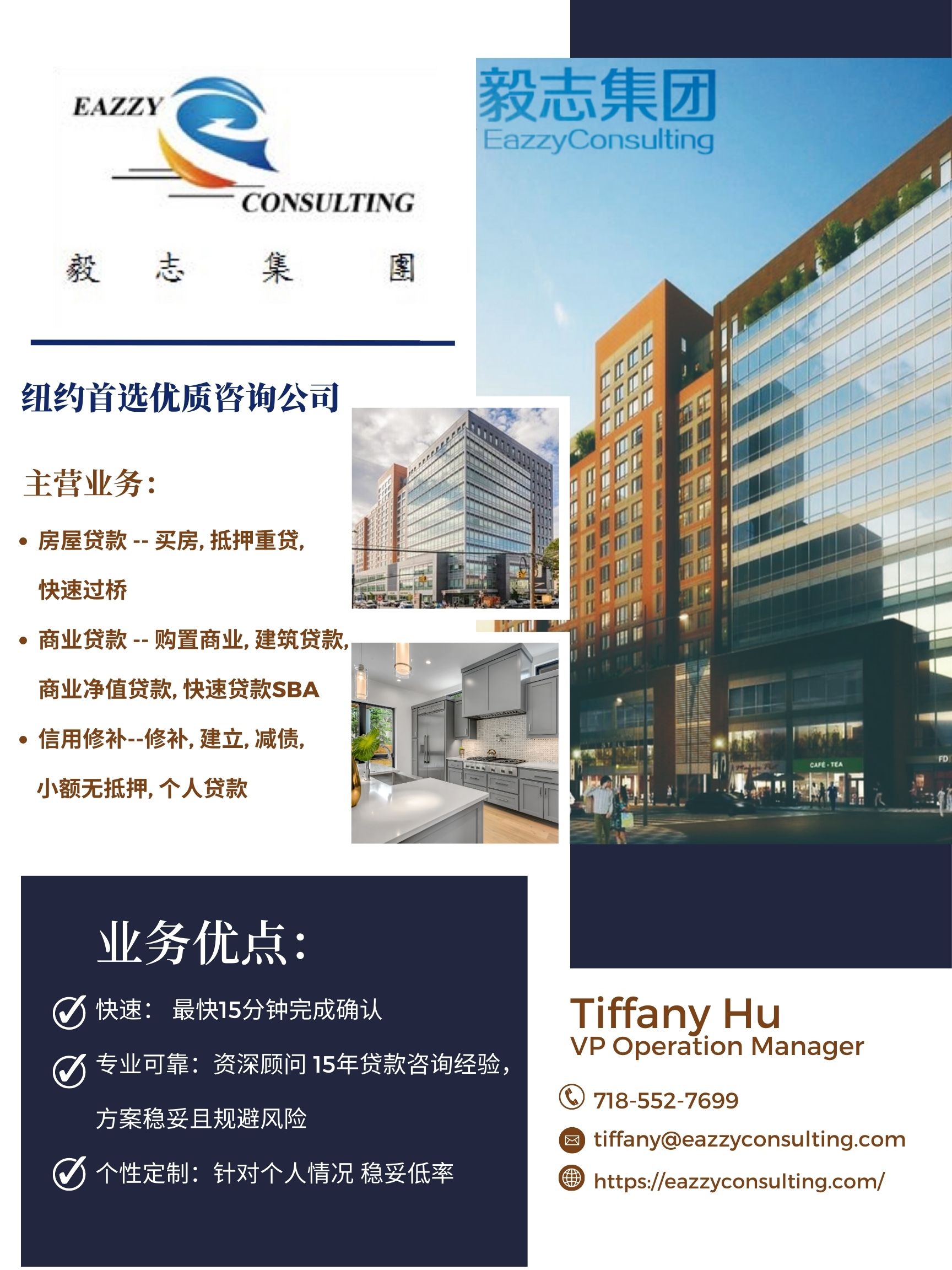 毅志集团,纽约首选的融资咨询公司。我们和全美上百家银行,500多家投资机构拥有良好的合作关系;我们的财务顾问拥有多年的融资与银行专业经验。无论是商业,房屋还是建筑贷款,我们都可以为您量身定制最适合的贷款方案;无论是报税低,信用差,还是无身份,毅志集团都将为您解决融资困难的问题,并为您获得最优的利率。我们的业务覆盖全美50个州。