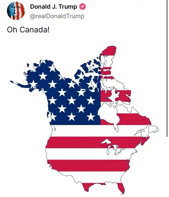 报道提到,当地时间7日早些时候,特朗普在其自创社交平台发布一张“加拿大被纳入美国”之后的“美国全新版图”。在这张图中,加拿大和美国被涂成同一种颜色,上面用英文大写字母写着“美国(UNITED STATES)”。此前几分钟,特朗普还在另一条帖文配图中将美国和加拿大领土“合并”,并为“全新版图”填充上美国国旗图案,配文“哦,加拿大!”
