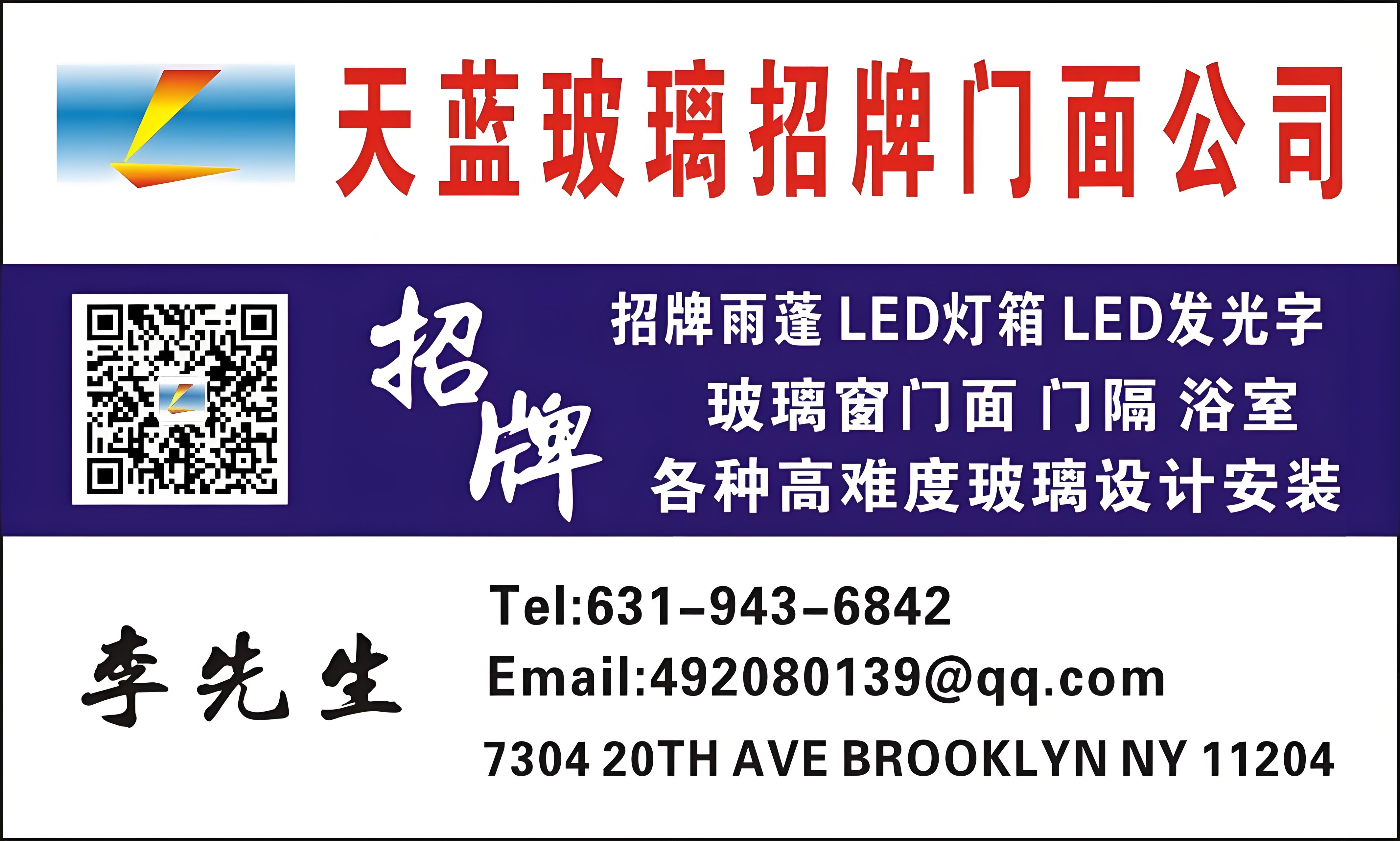 天蓝广告招牌/铝合金玻璃门面公司专业翻新制作各类广告雨棚、立体发光字,PVC字、室内外灯箱、各种贴字,定制喷画和餐馆、按摩、指甲店logo印刷、名片。旧招牌翻新更换!铝合金门窗,门面玻璃门,浴室玻璃门、隔段。纽约五大地区及周边免费设计安装,提供上门咨询服务,长岛康洲费城新泽西纽泽西等外州也可服务,可以做招牌申请、长岛、康州